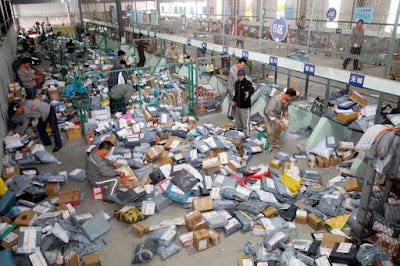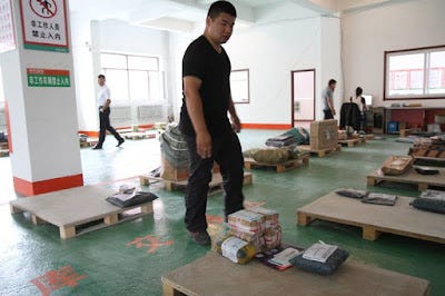 There is some evidence in this video about people making multiple orders as in some rural centers there is a single woman who places multiple orders for an entire village. The distribution center however is not heavily endowed with advanced technology. There is no evidence that in any way the capital equipment at Alibaba and its distribution partnership comes close in scale and quality to the infrastructure of (say) UPS. However the delivery volumes are larger than UPS and Fedex combined and the employment levels are similar (in aggregate).